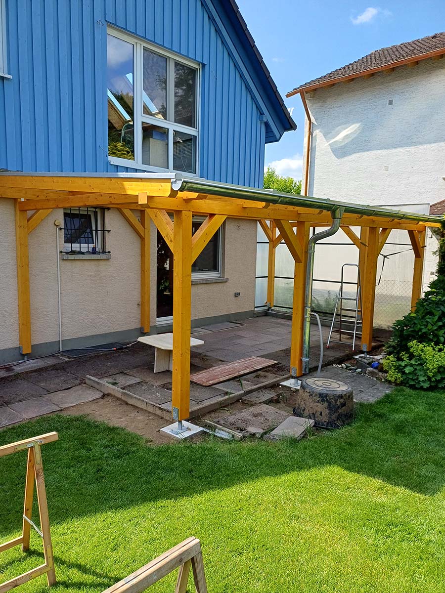 Die zahlreichen individuellen Möglichkeiten beim Bau eines Carports bieten wir Ihnen als Odenwälder Meisterbetrieb selbstverständlich in Gänze an. Ein freistehendes Modell oder ein angebautes sind möglich, als Dach haben Sie die Wahl zwischen einem Anlehndach (bei angebauten Modellen), einem Pultdach (flach geneigte Dachfläche) oder einem Satteldach (steilerem Winkel beider Dachflächen begünstigt schnelles Abfließen von Regenwasser). Das bevorzugte Holz unserer Schreinerei ist Leimholz oder auch Brettschichtholz genannt aus Fichte, das sich nicht verzieht. Für eine besondere Langlebigkeit arbeiten wir aber auch mit Sibirischer Lärche oder Douglasie. Als Dachabdeckung haben Sie die Wahl zwischen Wellbitumen, Ziegeln oder Trapezblech. Als Terrassenüberdachung eingesetzt bietet sich Plexiglas als Abdeckung an. Auch die Farbe Ihres Unterstands ist frei wählbar: Bevorzugen Sie eine offenporige Lasur, die das Gesamtbild des Holzes zum Vorschein bringt, oder soll es lieber ein Deckanstrich in der Farbe Ihres Hauses sein? Benötigen Sie vielleicht auch noch eine Tür oder ein Fenster?