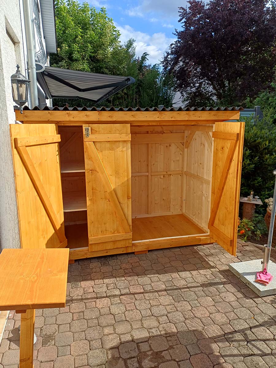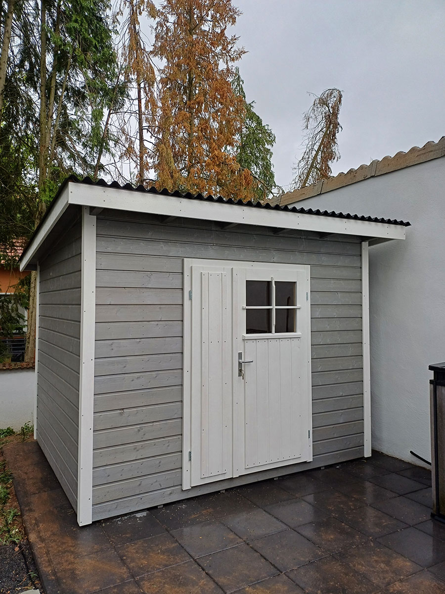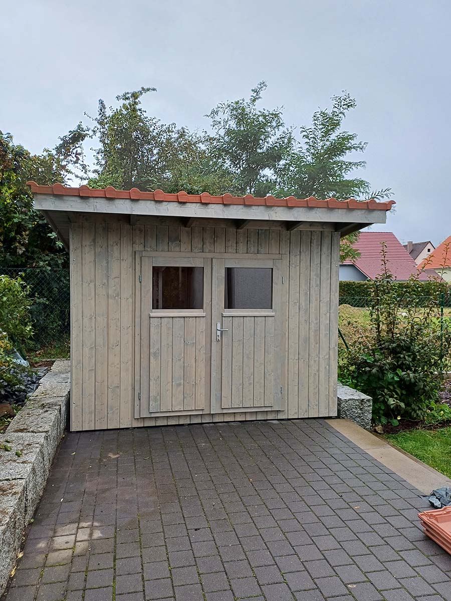 Unser Meisterbetrieb bietet Ihnen auch bei diesem kleinen Bruder des Gartenhauses einen individuell auf Sie zugeschnittenen Service. Das Grundgerüst besteht auch hier aus einer Rahmenkonstruktion ähnlich eines Fachwerkhauses - die Massivholzrahmen aus Nordischer Fichte werden mit Schlitz und Zapfen verbunden, dies garantiert jahrzehntelange Haltbarkeit. Das Gerüst wird in unserer Schreinerei mit einem 19mm starkem Rundkantprofil aus nordischem Fichtenholz senkrecht verkleidet, alternativ bietet sich die waagerechte Blockhausschalung mit einer Stärke von 24mm an. Als Holzvarianten gibt es auch hier Sibirische Lärche und Douglasie. Der Boden besteht in der Regel aus den Steinplatten, auf denen der Geräteschuppen steht, oder aus einem Holzboden. Das Dach ist meist niedriger als das eines Garten- oder Blockhauses und mit Wellbitumen eingedeckt. Auch hier können Sie zwischen einem Pultdach oder einem Satteldach wählen.