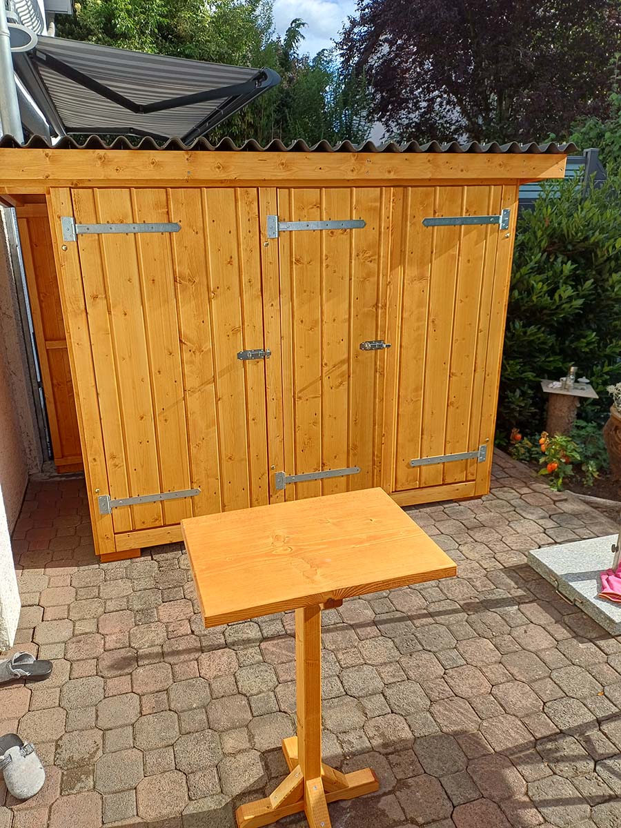 Wie bei allen Produkten unseres Brensbacher Handwerksbetriebs können Sie auch bei unseren kleinen Lauben diverse Details individuell anpassen. So lassen sich zum Beispiel die Stirnbretter für die Front glatt oder geschwungen anfertigen. Im Allgemeinen bauen wir unsere Gerätehäuser ohne Fenster, für Licht sorgt stattdessen ein feststehendes Oberlicht – aber auch hier haben sie natürlich die Wahl. Ein besonderes Augenmerk sollte auf die Tür gelegt werden: Breit und möglichst ebenerdig sollte sie sein, damit Rasenmäher und Fahrräder leicht hineingeschoben werden können. In unserer Schreinerei bieten wir zu diesem Zweck einen zweiten Türflügel an, sodass Sie die Tür Ihres Gerätehauses mit einer Breite zwischen 120 bis 160cm planen können – wahlweise mit oder ohne Vordach. Selbstverständlich ist ein Gerätehaus auch als Anbau möglich, zum Beispiel an eine bestehende Garage.